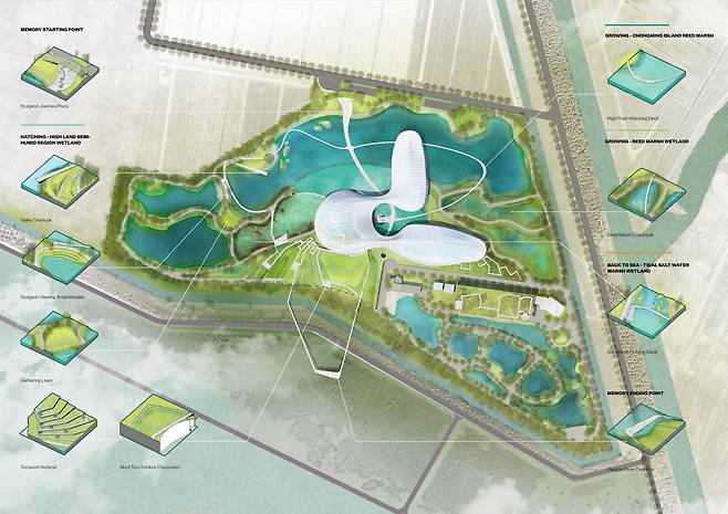 철갑상어의 번식과 서식을 관찰할 수 있는 데크가 강 주변을 아우르듯 펼쳐져 있고, 그 위에 방주형 돔형 지붕이 부드럽게 천장을 덮고 있는 형상이다. 물결 모양의 곡면형 매스가 강물의 잔잔한 표면과 어우러져 신비로우면서도 묘한 건축적 풍경을 엮어낸다.