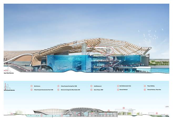 ● 멋진 세상 속 건축디자인_ 양쯔강 하구 중국 철갑상어 자연보존관(Yangtze River Estuary Chinese Sturgeon Nature Preserve)… 철갑상어의 등뼈 형상을 모티브로 한 유연한 방주형 지붕 구조, 철갑상어 생육환경을 관찰할 수 있는 내외부의 통합된 공간 프로그램