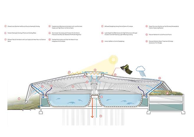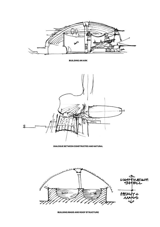 설계를 맡은 에너아드 아키텍츠는 철갑상어의 유연한 모습에서 착안한 유선형의 매끄러운 방주형 구조와 지형의 높낮이에 맞추어 앉힌 직방형 매스 디자인을 조합한 건축을 선보였다. 주변 자연과 동화된 듯한 경관 속에 특별한 존재감을 드러내는 자연보존관 공간 프로그램은 크게 아쿠아리움과 연구시설의 기능을 두루 포함한다.