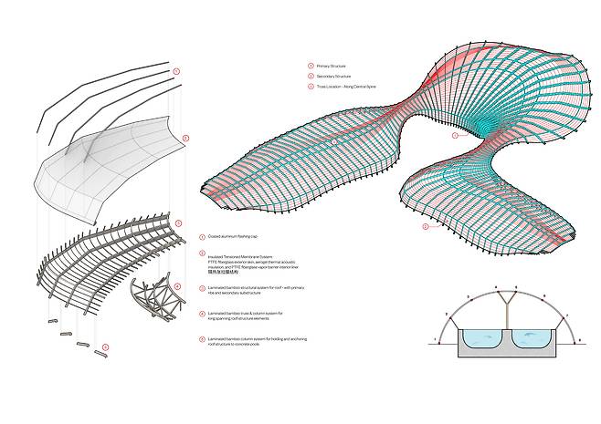 돔형 지붕 구조는 부드럽게 휜 갈비뼈 형상으로 마치 철갑상어의 등뼈를 연상케 한다. 건물 표면은 반투명 경량 PTFE로 마감되어 자연광을 부드럽게 흡수하며 내부 철갑상어의 생육을 관찰할 수 있는 수족관으로의 부드러운 분위기를 북돋아준다. 유연한 지붕은 크로스 라미네이트 처리한 목재 시스템으로 촘촘한 골조를 형성한다. >>Architects_ Ennead Architects, Drone Footage/ Photography_ Charles Wong, Lingxiao Xie, 기사 출처_ 에이앤뉴스 AN NEWS(ANN NEWS CENTER) 제공