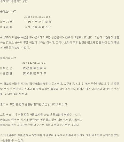 앞서 지난 2017년 9월9일 ‘사주논리여행’ 블로그를 운영하는 한 사주철학가는 “송중기와 송혜교의 궁합을 봐달라는 요청이 있었다”라며 두 사람의 궁합을 살펴봤다.