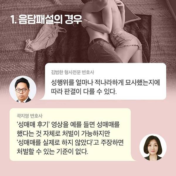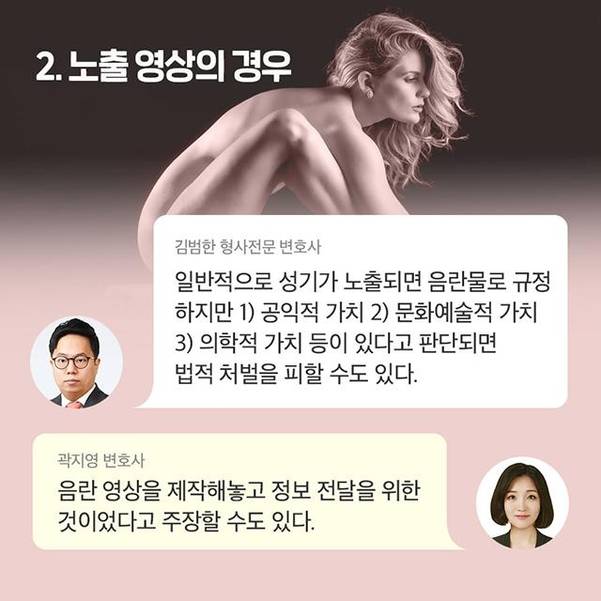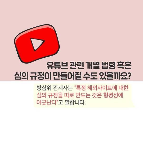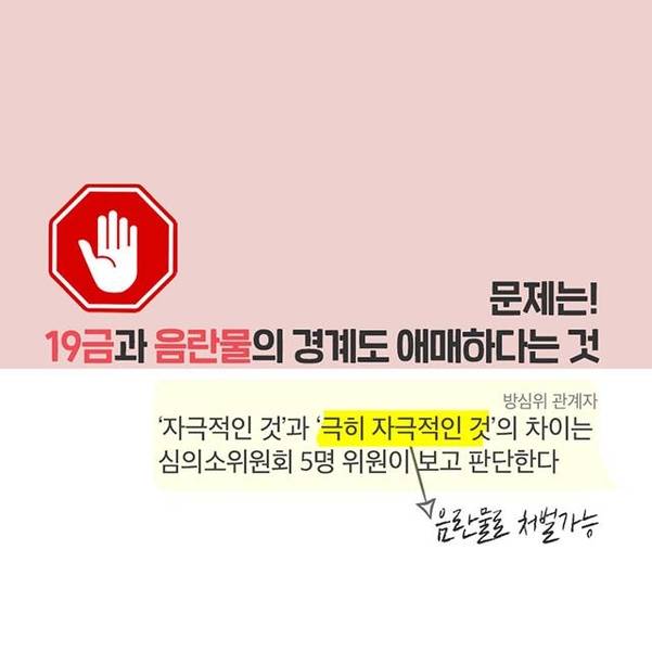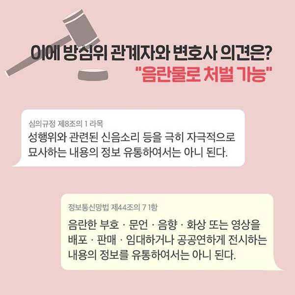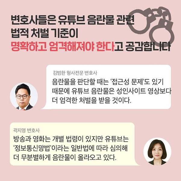 그러나 유튜브 음란물을 판단하는 법적 기준도 모호하다. 곽지영 변호사는 "방송과 영화는 개별 법령이 있지만 유튜브는 ‘정보통신망법’이라는 일반법에 따라 심의하고 있어서 음란물을 제재하기 어려운 구조"라고 설명했다.
