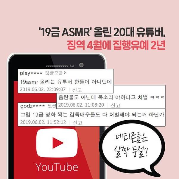 성 행위가 연상되는 소리, 이른바 ‘19금 ASMR(자율감각 쾌락반응)’을 녹음해 유튜브에 올린 20대가 지난 2일 징역 4월에 집행유예 2년을 선고받았다. A씨는 유튜브 채널에 남녀 성행위를 연상케 하는 음향 파일 22개를 만들어 올린 혐의로 재판에 넘겨졌다.