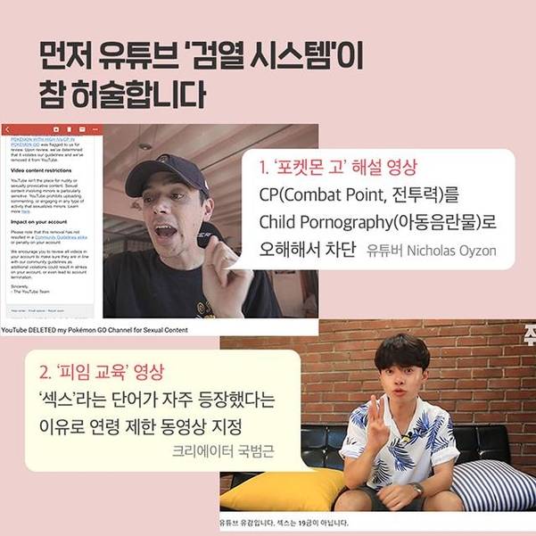 물론 유튜브는 자체 플랫폼에 ‘커뮤니티 가이드라인’을 두고 있다. 유튜브는 가이드라인을 위반한 영상을 찾아, 경고·삭제하고 있지만 시스템이 허술하다는 평이다. 게임 ‘포켓몬 고’ 용어인 CP(Combat Point)를 Child Pornography(아동 음란물)로 오해해 관련 영상이 일제히 삭제된 것이 대표적인 예다.