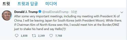 일본 오사카에서 열리는 주요 20개국(G20) 정상회의에 참석 중인 트럼프 대통령은 이날 트위터에 "북한 김 위원장이 이것을 본다면, 나는 DMZ에서 그를 만나 손을 잡고 인사(say Hello)를 할 수 있을 것"이라고 말했다.