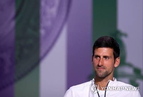 epa07684290 A handout photo made available by the AELTC shows Novak Djokovic of Serbia addressing to media during his pre-Championships press conference in the Main Interview Room during the Wimbledon Championships at the All England Lawn Tennis Club, in London, Britain, 29 June 2019. EPA/AELTC/Florian Eisele EDITORIAL USE ONLY/NO COMMERCIAL SALES