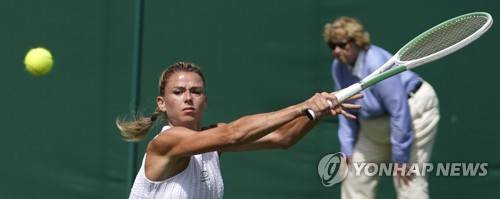 epa07687096 Camila Giorgi of Italy in action against Dayana Yastremska of Ukraine during their first round match at the Wimbledon Championships at the All England Lawn Tennis Club, in London, Britain, 01 July 2019. EPA/WILL OLIVER EDITORIAL USE ONLY/NO COMMERCIAL SALES