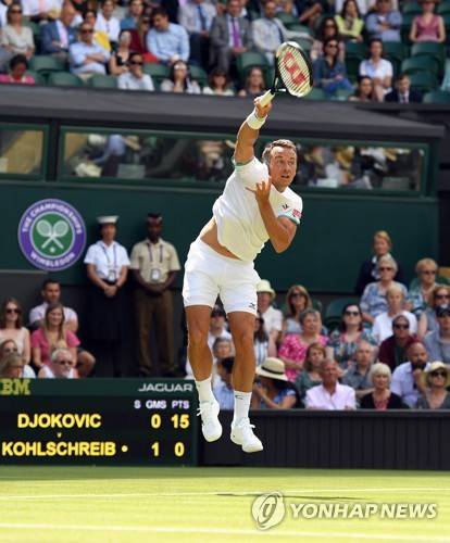 epa07687116 Philipp Kohlschreiber of Germany serves to Novak Djokovic of Serbia in their first round match during the Wimbledon Championships at the All England Lawn Tennis Club, in London, Britain, 01 July 2019. EPA/ANDY RAIN EDITORIAL USE ONLY/NO COMMERCIAL SALES