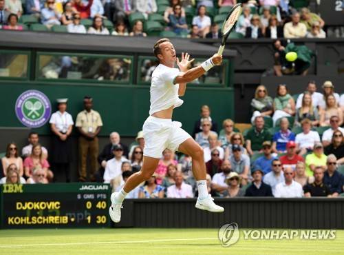 epa07687117 Philipp Kohlschreiber of Germany returns to Novak Djokovic of Serbia in their first round match during the Wimbledon Championships at the All England Lawn Tennis Club, in London, Britain, 01 July 2019. EPA/ANDY RAIN EDITORIAL USE ONLY/NO COMMERCIAL SALES