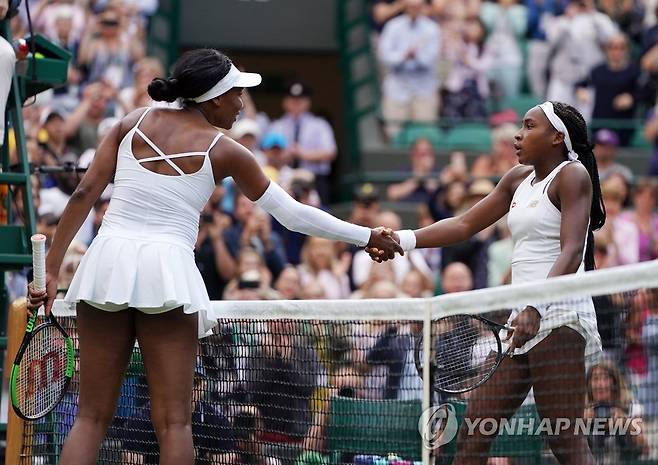 (런던 EPA=연합뉴스) 1일(현지시간) 영국 런던 윔블던 올잉글랜드클럽에서 열린 윔블던 테니스대회 여자단식 본선 1회전에서 승리한 코리 가우프(313위·미국·오른쪽)가 상대 비너스 윌리엄스(44위·미국)와 악수를 하고 있다. 이날 여자단식 본선 최연소와 최고령 선수 맞대결에서 15세 신예 가우프가 39세 베테랑 비너스를 2-0(6-4 6-4)으로 꺾었다.
