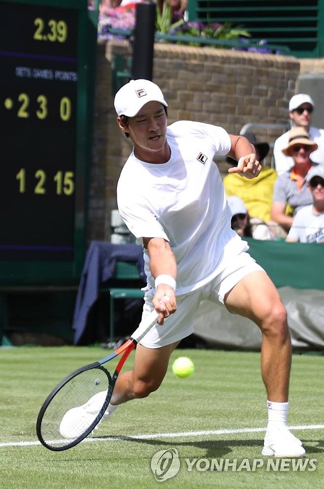 (서울=연합뉴스) 지난 1일(현지시간) 영국 런던 웜브런의 올잉글랜드클럽 18번 코트에서 열린 테니스 대회 첫날 남자 단식 1회전에서 권순우 선수가 세계 랭킹 9위 카렌 하차노프와 경기를 하고 있다. 2019.7.2 [대한테니스협회 제공. 재판매 및 DB 금지]