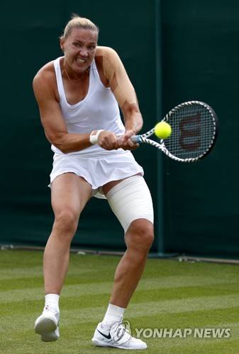 epa07689079 Kaia Kanepi of Estland in action against Stefanie Voegele of Switzerland during their first round match at the Wimbledon Championships at the All England Lawn Tennis Club, in London, Britain, 02 July 2019. EPA/NIC BOTHMA EDITORIAL USE ONLY/NO COMMERCIAL SALES