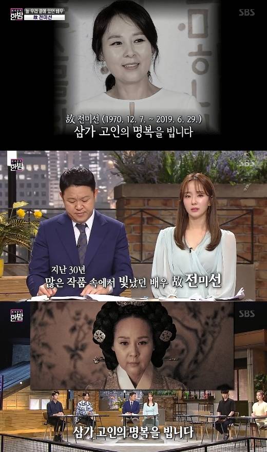 2일 방송된 SBS ‘본격연예 한밤’에서는 고 전미선 사망 사건을 다루는 한편 필모그래피를 돌아보며 고인을 추모했다.