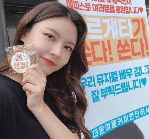 공개된 사진 속 나영은 팬들이 서포트한 커피차 앞에서 인증 사진을 촬영 중이다. 팬들은 '우리 뮤지컬 배우 김나영 잘 부탁드립니다'라는 문구로 나영을 응원하고 있다.