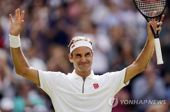 (런던 EPA=연합뉴스) 로저 페더러(3위·스위스)가 2일(현지시간) 영국 런던 윔블던의 올잉글랜드클럽에서 열린 윔블던 테니스대회 남자 단식 1회전 로이드 해리스(86위·남아공)와의 경기에서 3-1(3-6 6-1 6-1 6-2)로 승리, 2회전 진출을 확정 짓고 기뻐하고 있다.