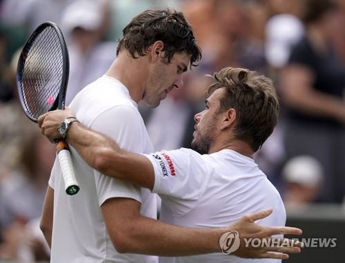 epa07692131 Reilly Opelka (L) of the USA celebrates winning against Stan Wawrinka of Switzerland in their second round match during the Wimbledon Championships at the All England Lawn Tennis Club, in London, Britain, 03 July 2019. EPA/WILL OLIVER EDITORIAL USE ONLY/NO COMMERCIAL SALES