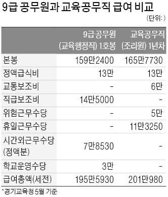 경기도의 한 초등학교에서 근무하는 교육행정직 9급 공무원 1호봉과 조리사 교육공무직원 1년차의 지난 5월 급여명세표를 비교해보면 교육공무직원 급여 총액이 201만980원으로 공무원(195만5930원)보다 더 높다.