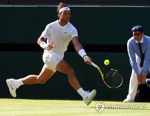 epa07695071 Rafael Nadal of Spain returns to Nick Kyrgios of Australia in their second round match during the Wimbledon Championships at the All England Lawn Tennis Club, in London, Britain, 04 July 2019. EPA/FACUNDO ARRIZABALAGA EDITORIAL USE ONLY/NO COMMERCIAL SALES
