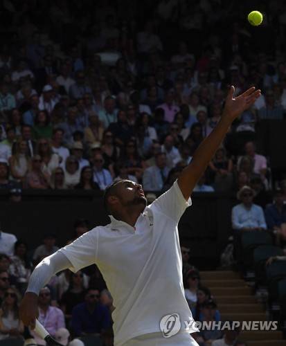 epa07695149 Nick Kyrgios of Australia serves to Rafael Nadal of Spain in their second round match during the Wimbledon Championships at the All England Lawn Tennis Club, in London, Britain, 04 July 2019. EPA/FACUNDO ARRIZABALAGA EDITORIAL USE ONLY/NO COMMERCIAL SALES
