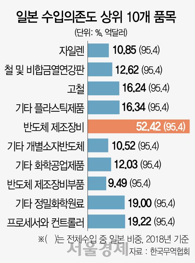 일본 수출제한 조치로 반도체·디스플레이 3대 핵심소재 품목의 수출통관 역시 이틀째 제대로 이뤄지지 않고 있다. 이날 산업통상자원부 관계자는 “4일부터 일본이 수출제한 조치에 들어가면서 수출허가를 내주지 않고 있는 것으로 파악됐다”며 “이 때문에 일본에서 수입하던 해당 품목들이 국내에 들어오지 못하고 있다”고 말했다. 일본 정부는 전날부터 반도체·디스플레이 제조 공정에 필요한 폴리이미드·포토리지스트(감광액)·고순도불화수소(에칭 가스)의 대한(對韓) 수출통제를 시작했다. /이수민·허세민기자 noenemy@sedaily.com