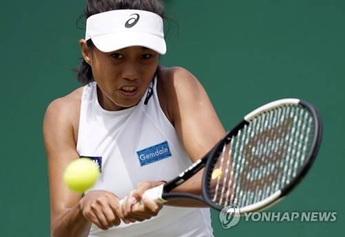 epa07696761 Shuai Zhang of China returns to Caroline Wozniacki of Denmark in their third round match during the Wimbledon Championships at the All England Lawn Tennis Club, in London, Britain, 05 July 2019. EPA/WILL OLIVER EDITORIAL USE ONLY/NO COMMERCIAL SALES