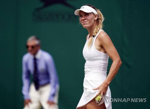epa07696777 Caroline Wozniacki of Denmark plays Shuai Zhang of China in their third round match during the Wimbledon Championships at the All England Lawn Tennis Club, in London, Britain, 05 July 2019. EPA/WILL OLIVER EDITORIAL USE ONLY/NO COMMERCIAL SALES