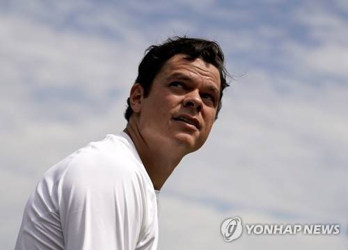 epa07697001 Milos Raonic of Canada reacts after winning against Reilly Opelka of the USA during their third round match at the Wimbledon Championships at the All England Lawn Tennis Club, in London, Britain, 05 July 2019. EPA/WILL OLIVER EDITORIAL USE ONLY/NO COMMERCIAL SALES