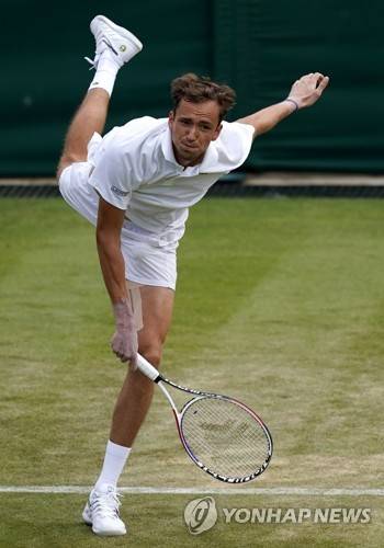 epa07697324 Daniil Medvedev of Russia in action against David Goffin of Belgium during their third round match at the Wimbledon Championships at the All England Lawn Tennis Club, in London, Britain, 05 July 2019. EPA/WILL OLIVER EDITORIAL USE ONLY/NO COMMERCIAL SALES