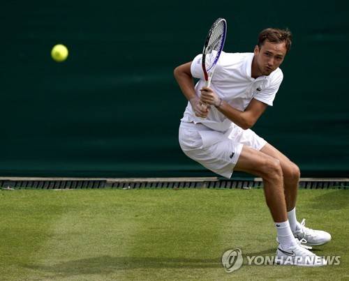 epa07697325 Daniil Medvedev of Russia in action against David Goffin of Belgium during their third round match at the Wimbledon Championships at the All England Lawn Tennis Club, in London, Britain, 05 July 2019. EPA/WILL OLIVER EDITORIAL USE ONLY/NO COMMERCIAL SALES