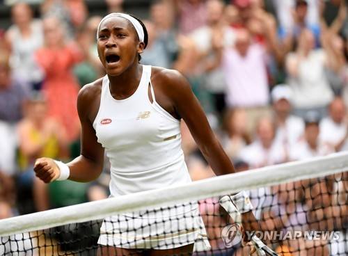 epa07697751 Cori Gauff of the USA in action against Polona Hercog of Slovenia during their third round match for the Wimbledon Championships at the All England Lawn Tennis Club, in London, Britain, 05 July 2019. EPA/ANDY RAIN EDITORIAL USE ONLY/NO COMMERCIAL SALES