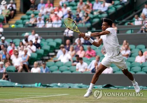 epa07697778 Felix Auger Aliassime from Canada in action against Ugo Humbert of France during their third round match at the Wimbledon Championships at the All England Lawn Tennis Club, in London, Britain, 05 July 2019. EPA/NIC BOTHMA EDITORIAL USE ONLY/NO COMMERCIAL SALES