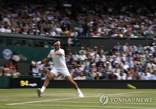 epa07699632 Roger Federer of Switzerland plays Lucas Pouille of France in their third round match during the Wimbledon Championships at the All England Lawn Tennis Club, in London, Britain, 06 July 2019. EPA/WILL OLIVER EDITORIAL USE ONLY/NO COMMERCIAL SALES