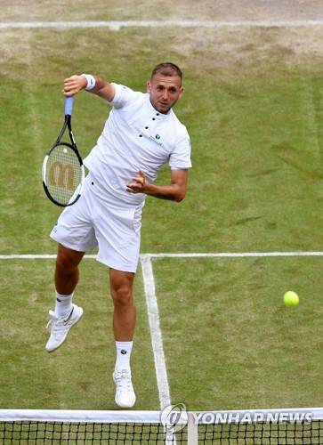 epa07699668 Daniel Evans of Britain in action against Joao Sousa of Portugal during their third round match at the Wimbledon Championships at the All England Lawn Tennis Club, in London, Britain, 06 July 2019. EPA/FACUNDO ARRIZABALAGA EDITORIAL USE ONLY/NO COMMERCIAL SALES