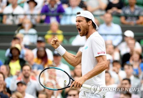 epa07699808 Joao Sousa of Portugal in action against Daniel Evans of Britain during their third round match at the Wimbledon Championships at the All England Lawn Tennis Club, in London, Britain, 06 July 2019. EPA/FACUNDO ARRIZABALAGA EDITORIAL USE ONLY/NO COMMERCIAL SALES