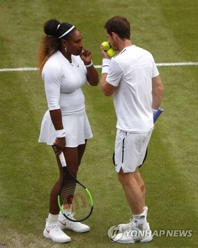 epa07699811 Andy Murray (R) of Britain and Serena Williams of the USA in action during their Mixed Doubles match against Andreas Mies of Germany and Alexa Guarachi of Chile at the Wimbledon Championships at the All England Lawn Tennis Club, in London, Britain, 06 July 2019. EPA/NIC BOTHMA EDITORIAL USE ONLY/NO COMMERCIAL SALES