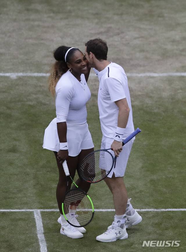 【런던=AP/뉴시스】세리나 윌리엄스(미국, 왼쪽)와 앤디 머레이(영국)가 6일(현지시간) 영국 런던 윔블던의 올잉글랜드클럽에서 열린 2019 윔블던 테니스대회 혼합복식 1회전에서 승리 후 입맞춤하고 있다.