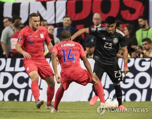 epa07702646 Mexico goalkeeper Hugo Gonzalez (R) in action against USA defender Reggie Cannon (C) and USA forward Jordan Morris (L) in the first half of the Concacaf final match between Mexico and the United States at Soldier Field in Chicago, Illinois, USA, 07 July 2019. EPA/TANNEN MAURY