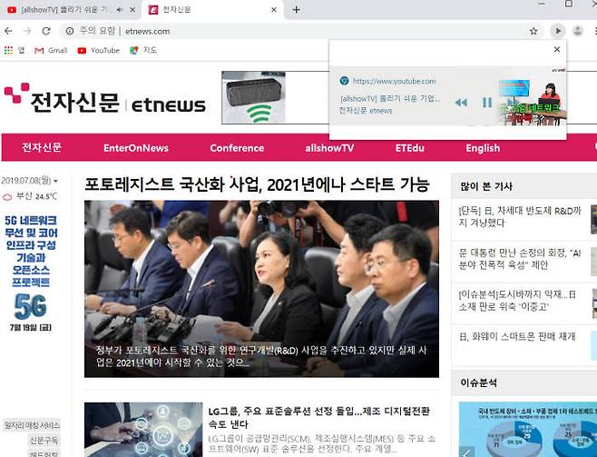 유튜브 창을 직접 열지 않고도 크롬 툴바에서 재생 중인 영상·음악의 정보를 확인하고 일시중지·재생할 수 있다.