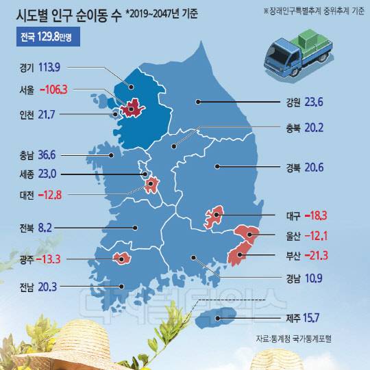 8일 통계청의 장래인구 특별추계 시도별 순이동 수(중위추계 기준)를 분석한 결과에 따르면 2019∼2047년 서울·부산·대구·광주·대전·울산 등 주요 광역시에서는 일제히 인구가 순유출하고, 도(道) 지역에서는 순유입하는 것으로 나타났다. 극심한 주택난을 겪는 청년층이 대도시에 정착하지 못한 채 출퇴근을 할 수 있는 근교로 이사하고, 고령화로 은퇴자들이 농촌으로 이사하는 흐름이 갈수록 뚜렷해질 것이라는 분석이다.