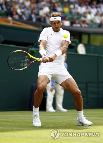 epa07703280 Rafael Nadal of Spain returns to Joao Sousa of Portugal in their fourth round match during the Wimbledon Championships at the All England Lawn Tennis Club, in London, Britain, 08 July 2019. EPA/NIC BOTHMA EDITORIAL USE ONLY/NO COMMERCIAL SALES