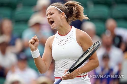 epa07703465 Karolina Muchova of the Czech Republic scores a set point winner against compatriot Karolina Pliskova in their fourth round match during the Wimbledon Championships at the All England Lawn Tennis Club, in London, Britain, 08 July 2019. EPA/WILL OLIVER EDITORIAL USE ONLY/NO COMMERCIAL SALES