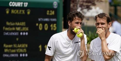 epa07703467 Robin Haase (L) of the Netherlands and Frederik Nielsen of Denmark in action against Raven Klaasen of South Africa and Michael Venus of New Zealand during their Men's Doubles match at the Wimbledon Championships at the All England Lawn Tennis Club, in London, Britain, 08 July 2019. EPA/WILL OLIVER EDITORIAL USE ONLY/NO COMMERCIAL SALES