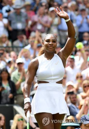 epa07703495 Serena Williams of the USA celebrates winning against Carla Suarez Navarro of Spain during their fourth round match for the Wimbledon Championships at the All England Lawn Tennis Club, in London, Britain, 08 July 2019. EPA/ANDY RAIN EDITORIAL USE ONLY/NO COMMERCIAL SALES
