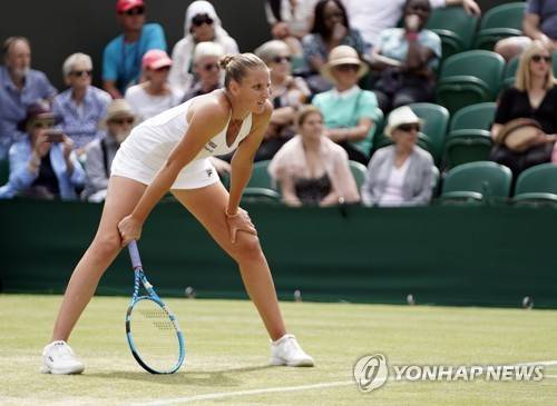 epa07703496 Karolina Pliskova of the Czech Republic plays compatriot Karolina Muchova in their fourth round match during the Wimbledon Championships at the All England Lawn Tennis Club, in London, Britain, 08 July 2019. EPA/WILL OLIVER EDITORIAL USE ONLY/NO COMMERCIAL SALES
