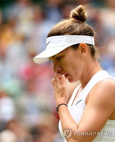epa07703530 Simona Halep of Romania in action against Cori Gauff of the USA during their fourth round match for the Wimbledon Championships at the All England Lawn Tennis Club, in London, Britain, 08 July 2019. EPA/ANDY RAIN EDITORIAL USE ONLY/NO COMMERCIAL SALES