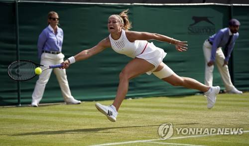 epa07703903 Karolina Muchova of the Czech Republic returns to compatriot Karolina Pliskova in their fourth round match during the Wimbledon Championships at the All England Lawn Tennis Club, in London, Britain, 08 July 2019. EPA/WILL OLIVER EDITORIAL USE ONLY/NO COMMERCIAL SALES