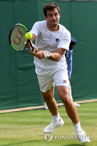 epa07704049 Guido Pella of Argentina in action against Milos Raonic of Canada during their fourth round match for the Wimbledon Championships at the All England Lawn Tennis Club, in London, Britain, 08 July 2019. EPA/FACUNDO ARRIZABALAGA EDITORIAL USE ONLY/NO COMMERCIAL SALES
