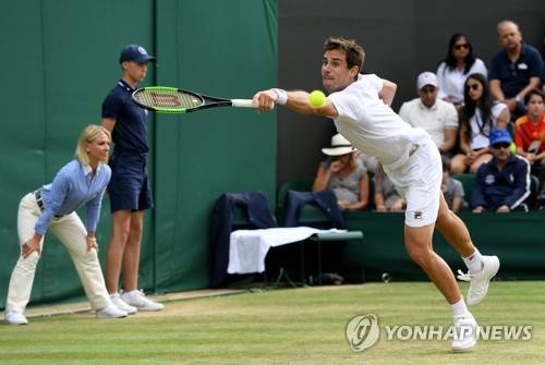 epa07704050 Guido Pella of Argentina in action against Milos Raonic of Canada during their fourth round match for the Wimbledon Championships at the All England Lawn Tennis Club, in London, Britain, 08 July 2019. EPA/FACUNDO ARRIZABALAGA EDITORIAL USE ONLY/NO COMMERCIAL SALES