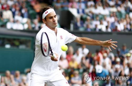 epa07704051 Roger Federer of Switzerland returns to Matteo Berrettini of Italy in their fourth round match during the Wimbledon Championships at the All England Lawn Tennis Club, in London, Britain, 08 July 2019. EPA/NIC BOTHMA EDITORIAL USE ONLY/NO COMMERCIAL SALES