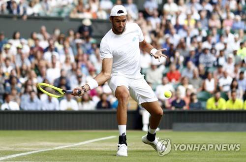 epa07704052 Matteo Berrettini of Italy returns to Roger Federer of Switzerland in their fourth round match during the Wimbledon Championships at the All England Lawn Tennis Club, in London, Britain, 08 July 2019. EPA/NIC BOTHMA EDITORIAL USE ONLY/NO COMMERCIAL SALES